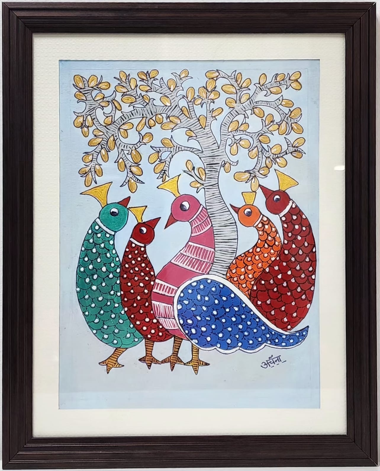 This gond painting titled Five Peacocks is a finely handcrafted artwork rooted in the visual language of traditional Gond art. Created on handmade paper, the composition reflects the artist’s devotion to indigenous storytelling, rhythmic patterns, and cultural symbolism. Every detail is drawn by hand, preserving the authenticity and soul of this ancient tribal art form.