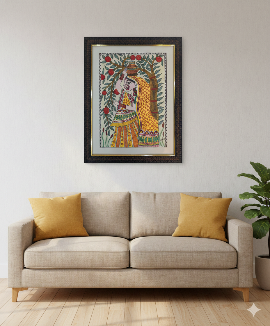 This Madhubani Painting Art is a tribute to the quiet strength and elegance of rural Indian life. Handcrafted with care, it reflects the harmony between human presence and nature, expressed through rhythmic patterns, balanced composition, and traditional symbolism. Each stroke is applied patiently, making this artwork a unique original rather than a reproduced print.